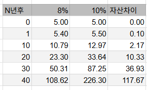 하지만 20년 후에는 10억, 40년 후에는 117억이나 차이가 난다.